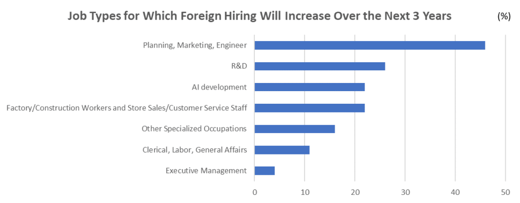 When asked about their hiring policies for the next three years, 99.2% of companies said they plan to hire foreign workers either proactively or as needed. Interestingly, the top reason cited was “securing diversity” (38.2%), which surpassed “addressing labor shortages” (19.0%). Diversity is increasingly seen as a catalyst for innovation, enabling teams with varied perspectives and experiences to generate new ideas and drive technological advancement.