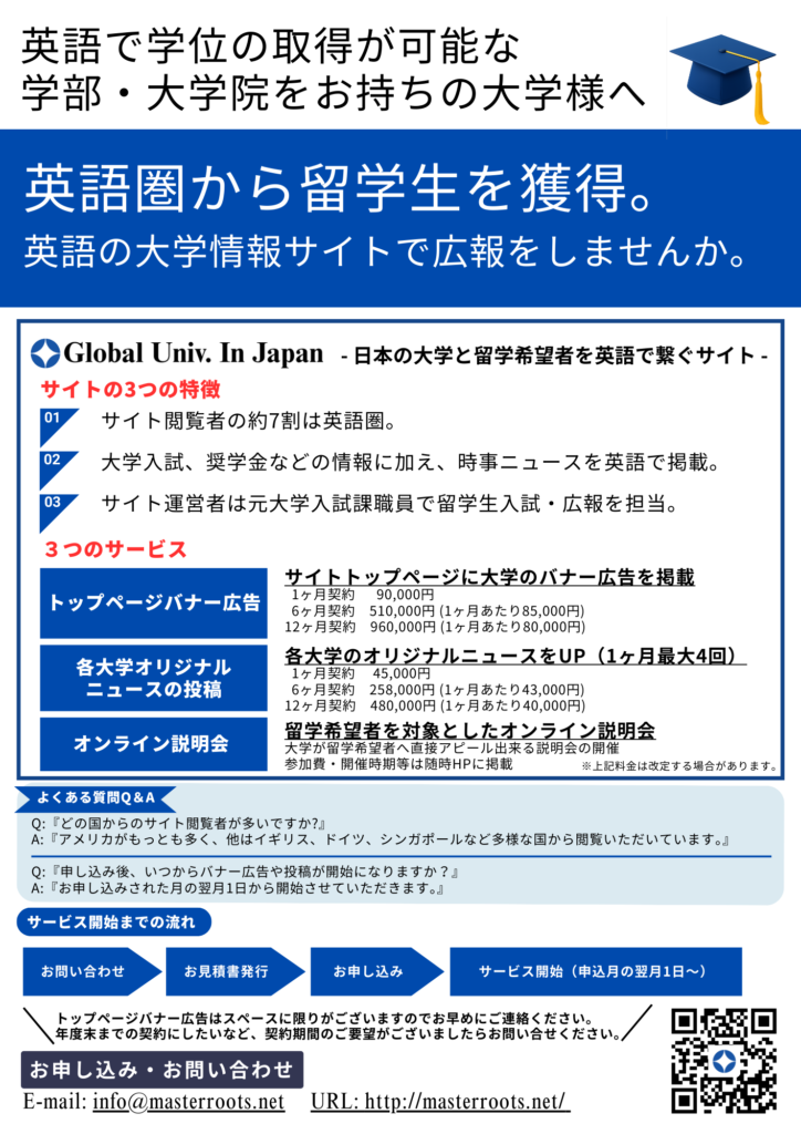 Global Univ. In Japanではトップページバナー広告オリジナルニュース投稿のサービス、そしてオンライン説明会を提供し、貴大学の留学生獲得に貢献出来ればと思います。