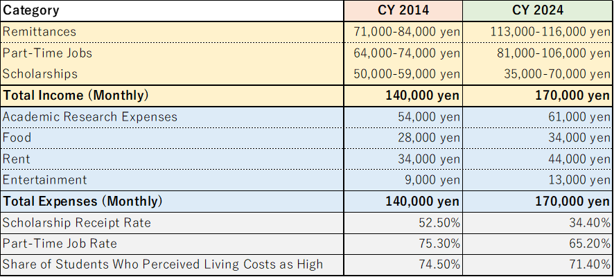 According to the same survey, the average monthly expenditure for international students across Japan is ¥170,000. Part-time work for international students is legally restricted to 28 hours per week during academic terms, and up to 40 hours per week during long vacation periods.