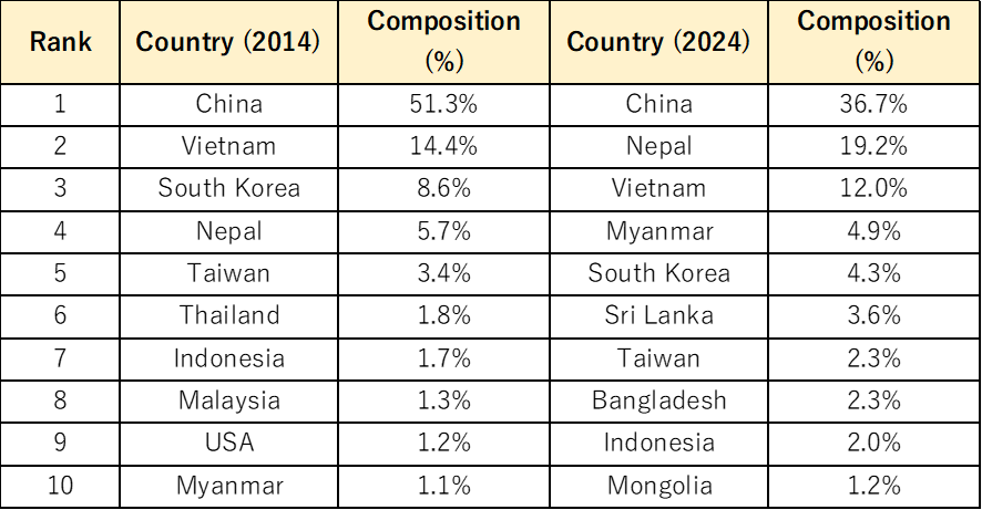 When broken down by country or region, Chinese students remain the largest group among international students in Japan. Although their share has declined from 51% in 2014 to 37% in 2024 over the past decade, they still represent the largest nationality cohort.